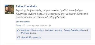 «φυζίκ» συνταξιούχου Αργεντίνου ζιγκολό ή παλιού γκαρσονιού στο «Διόνυσο». Είναι από αυτούς που θα μας «σώσουν»…Ερμη Πατρίδα», ήταν η ανάρτησή του η οποία όπως λένε όλοι στα γραφεία της Λεωφόρου Συγγρού φωτογραφίζει τον υπουργό Επικρατείας, βουλευτή Θεσσαλονίκης και επίσης στενό φίλο του Αντώνη Σαμαρά, Δημήτρη Σταμάτη…