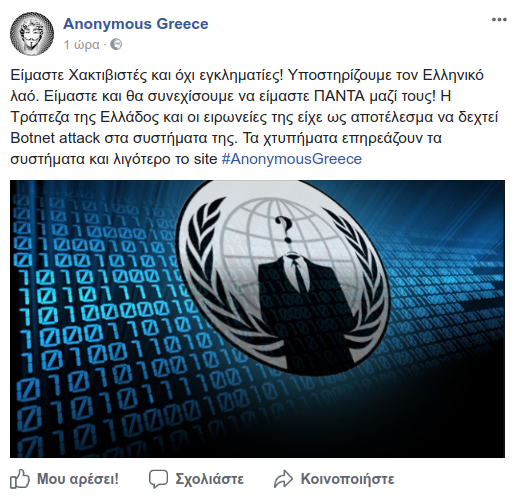 «Είμαστε Χακτιβιστές και όχι εγκληματίες! Υποστηρίζουμε τον Ελληνικό λαό. Είμαστε και θα συνεχίσουμε να είμαστε ΠΑΝΤΑ μαζί τους! Η Τράπεζα της Ελλάδος και οι ειρωνείες της είχε ως αποτέλεσμα να δεχτεί Botnet attack στα συστήματά της. Τα χτυπήματα επηρεάζουν τα συστήματα και λιγότερο το site. #AnonymousGreece».