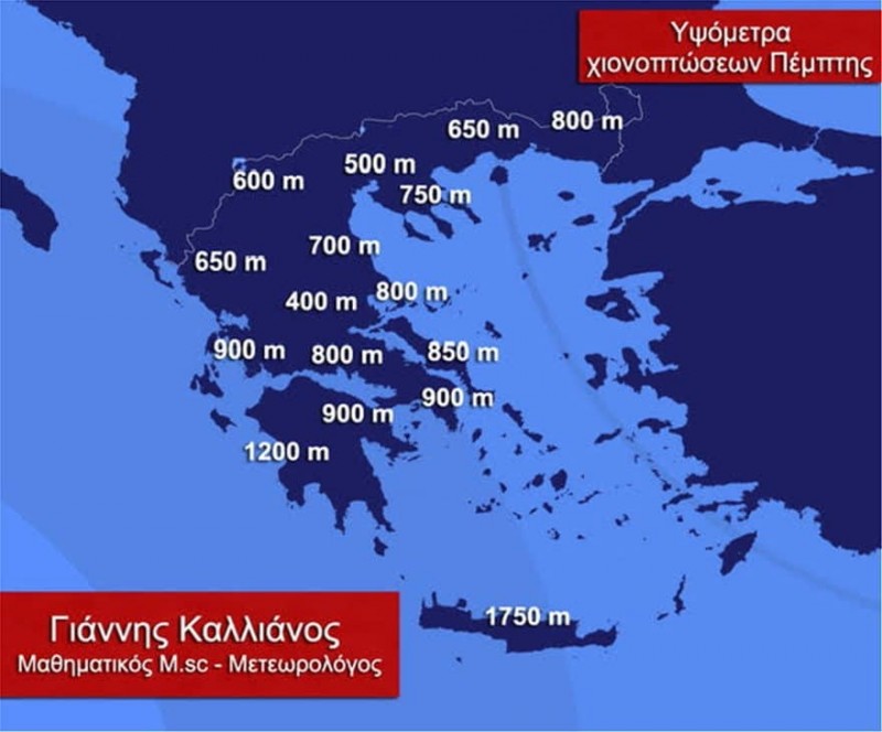 Στην πρόγνωση του για τον καιρό της Πέμπτης ο Μετεωρολόγος Γιάννης Καλλιάνος αναφέρει: «Θα πρέπει να σας πω ότι από πολύ νωρίς το πρωί της Πέμπτης θα μας προσεγγίσει από τη δυτική Ελλάδα ένα «σύστημα» με νοτιάδες και νεφώσεις που θα είναι εφοδιασμένες με μεγάλα ποσά υγρασίας. Αυτές οι νεφώσεις θα συναντήσουν τα ήδη παγωμένα εφάφη (λόγω εγκλωβισμού ψύχους από τις προηγούμενες ημέρες) της ηπειρωτικής Ελλάδας, και έτσι, αντί να βρέξει, αρχικά θα ξεκινήσει να χιονίζει ακόμη και σε χαμηλά υψόμετρα αλλά στη συνέχεια τα επίπεδα παγοποίησης θα ανέβουν με αποτέλεσμα στις περισσότερες περιοχές να το γυρίσει σε βροχή».