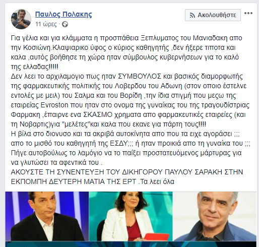 Και “κλείνει” την ανάρτησή του καλώντας όσους τη διαβάζουν να ακούσουν τα όσα είπε ο Παύλος Σαράκης, δικηγόρος των προστατευόμενων μαρτύρων των αμερικανικών αρχών, στην εκπομπή Δεύτερη Ματιά της ΕΡΤ…