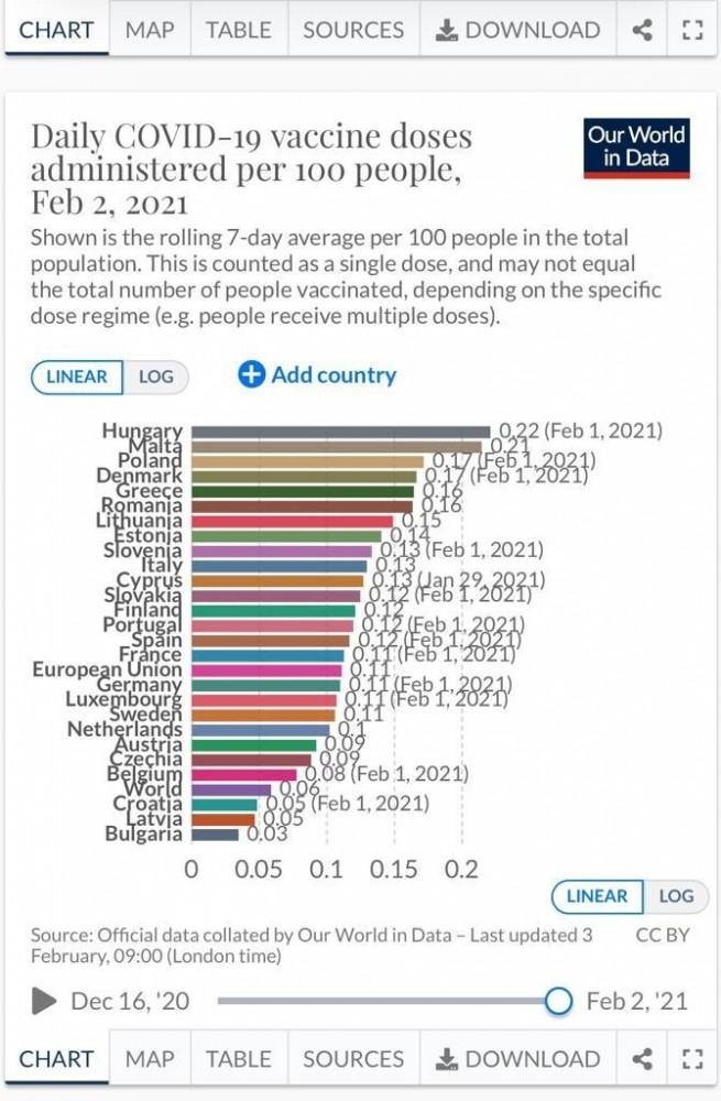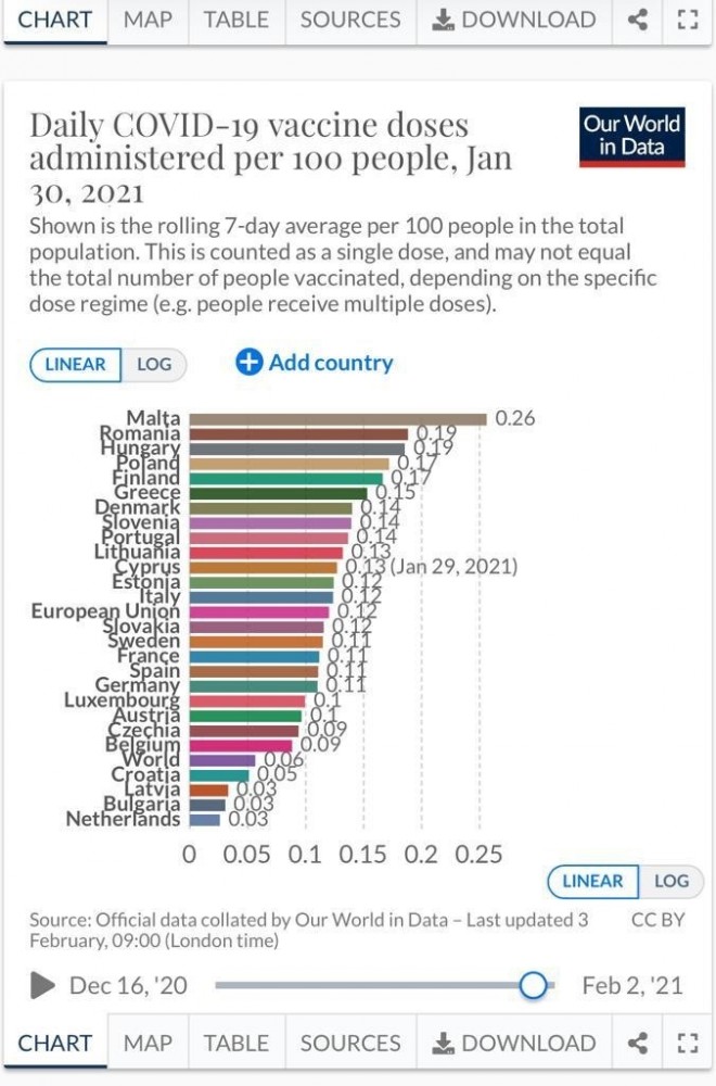 Μάλιστα, ο υφυπουργός παραθέτει εκ νέου την πηγή των δεδομένων που «τεκμηριώνουν την τοποθέτησή του και συγκεκριμένα την έγκυρη βάση δεδομένων Our world in data που στις 30/1 εμφάνιζε την Ελλάδα στην 5η θέση στην ΕΕ των 27. Στην ίδια θέση μάλιστα παρέμενε η χώρα μας με βάση τα πιο πρόσφατα στοιχεία της ίδιας πηγής».