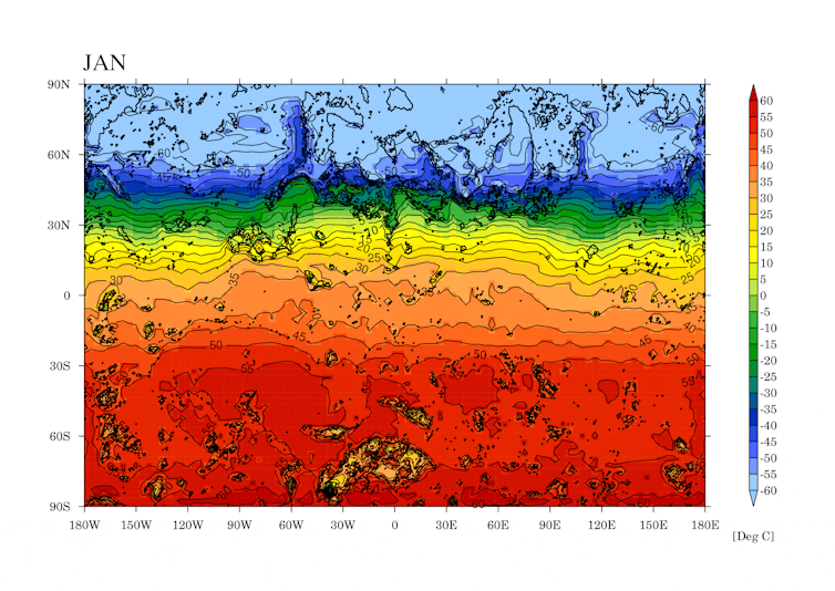 Το μοντέλο όμως λέει μια διαφορετική ιστορία. Στην τροπική ζώνη οι θερμότεροι μήνες φτάνουν τους 45 βαθμούς Κελσίου, ενώ στους ψυχρότερους η θερμοκρασία δεν πέφτει κάτω από τους 15, συνθήκες παρόμοιες με αυτές της Γης. Όσο ανεβαίνουμε προς τους πόλους οι συνθήκες γίνονται πιο σκληρές, με το καλοκαίρι να φτάνει στους 70 βαθμούς Κελσίου και το χειμώνα τους -75 βαθμούς. Αυτό εξηγείται λόγω της ατμοσφαιρικής υγρασίας και την υψηλή συγκέντρωση νεφών στις πολικές περιοχές μιας και οι υδρατμοί λειτουργούν ως αέρια θερμοκηπίου.
