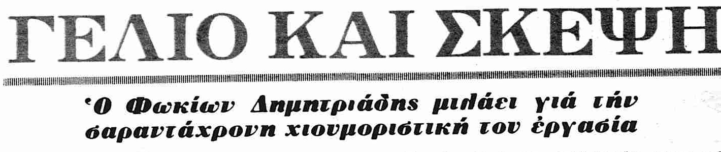 Ο Φωκίων Δημητριάδης, Φώκος για τους φίλους του, συνέχισε τη χιουμοριστική παράδοση του Θέμου Άννινου. Το σκίτσο του διακρίνεται για την εικονογραφική του πληρότητα, τη σημασία στη λεπτομέρεια και τον υψηλό τόνο της σάτιρας. Οι φιγούρες του δεν είναι στατικές, αλλά έχουν παλμό, ζωντάνια και κίνηση, απεικονίζοντας ταυτόχρονα ψυχικές καταστάσεις.