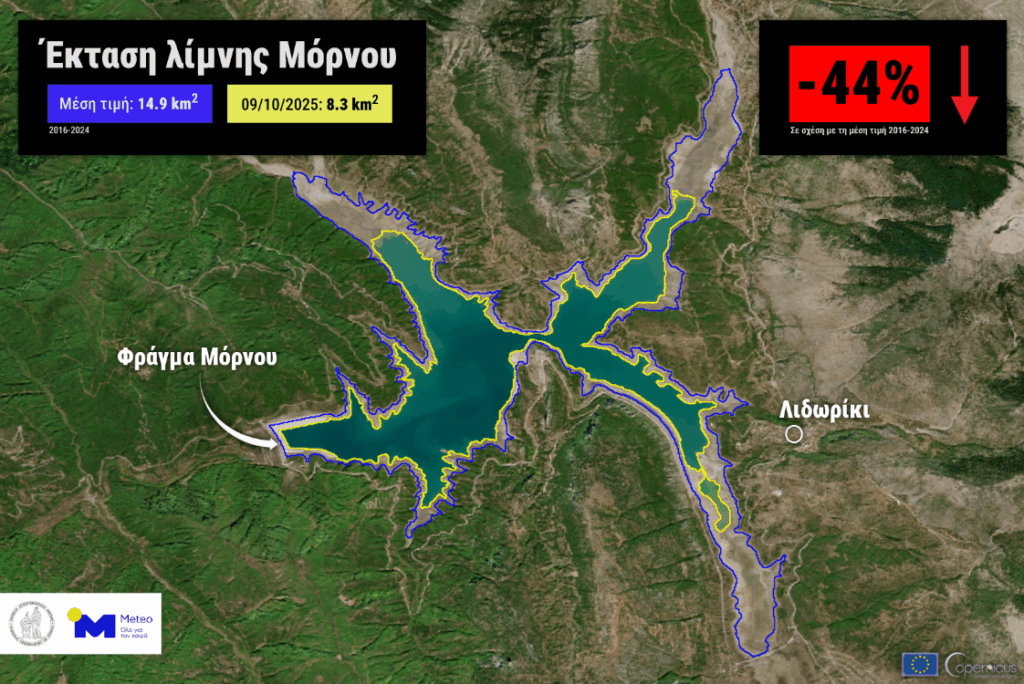 Δορυφορικά δεδομένα από το Εθνικό Αστεροσκοπείο Αθηνών επιβεβαιώνουν την ανησυχητική κατάσταση: η έκταση της λίμνης Μόρνου έχει μειωθεί στα 8,3 τετραγωνικά χιλιόμετρα, σημειώνοντας συρρίκνωση κατά 44% σε σχέση με τη μέση τιμή της περιόδου 2016-2024 (14,9 km²). Η πτώση αυτή αποκαλύπτει ένα σχεδόν απόκοσμο τοπίο, με το βυθισμένο χωριό Κάλλιο να αναδύεται, θυμίζοντας τις εικόνες της μεγάλης ξηρασίας στις αρχές της δεκαετίας του ’90. Πλάνα drone από τις 15 Σεπτεμβρίου 2025 δείχνουν ξεκάθαρα τη δραματική μείωση της στάθμης του νερού.