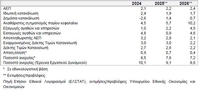 Σύμφωνα με την Εισηγητική Έκθεση του Προϋπολογισμού οι εξελίξεις των βασικών μακροοικονομικών μεγεθών παρουσιάζονται στον Πίνακας 1 που ακολουθεί.