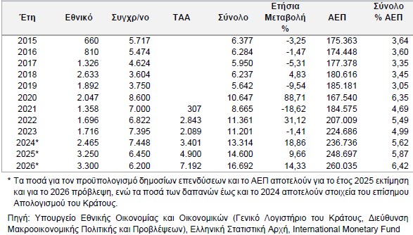 Παράλληλα οι Δαπάνες Προϋπολογισμού Δημοσίων Επενδύσεων (εκτός Ταμείου Ανάκαμψης και Ανθεκτικότητας) , για το έτος 2026 διατίθενται πόροι ύψους 9.500 εκατ. ευρώ, (μειωμένες σε σχέση με το 2025 όπου ανέρχονταν σε 9.700 εκατομμύρια ευρώ) με κατανομή της συνολικής δαπάνης μεταξύ των έργων που θα συγχρηματοδοτηθούν από πόρους της ΕΕ, ύψους 6.200 εκατ. ευρώ και εκείνων που θα χρηματοδοτηθούν αποκλειστικά από εθνικούς πόρους, ύψους 3.300 εκατ. ευρώ.