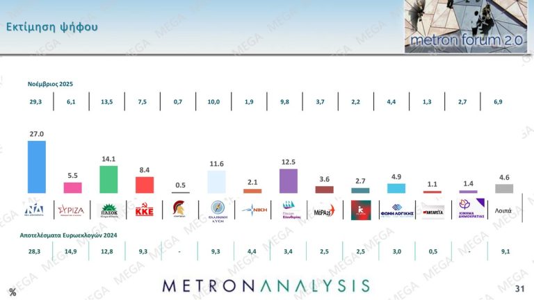 Στην εκτίμηση ψήφου, η Νέα Δημοκρατία παραμένει πρώτη, ωστόσο περιορίζεται στο 27%, από 29,3% τον Νοέμβριο. Το ΠΑΣΟΚ ανεβαίνει στο 14,1%, ενώ σημαντική άνοδο εμφανίζουν η Πλεύση Ελευθερίας με 12,5% και η Ελληνική Λύση με 11,6%. Το ΚΚΕ ακολουθεί με 8,4%, ο ΣΥΡΙΖΑ με 5,5%, ενώ εντός Βουλής κινούνται ακόμη η Φωνή Λογικής και το ΜέΡΑ25.