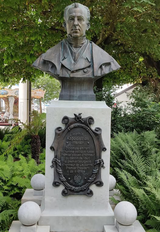 «Ιωάννης Καποδίστριας (1776–1831). Διαπρεπής Ρώσος διπλωμάτης και πολιτικός. Πρώτος επίτιμος πολίτης του καντονιού της Βω και της Λωζάνης. Πρώτος πρόεδρος της Ελλάδας».