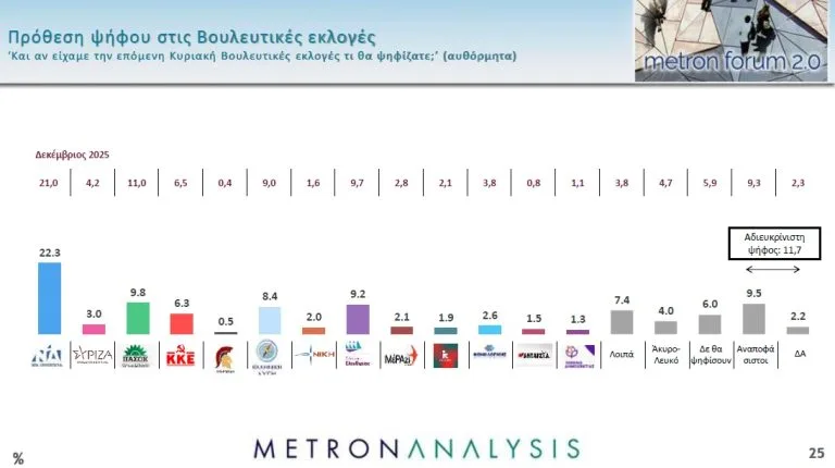 Στην πρόθεση ψήφου, η Νέα Δημοκρατία συγκεντρώνει 22,3%, το ΠΑΣΟΚ – Κίνημα Αλλαγής υποχωρεί στο 9,8% από 11%, η Πλεύση Ελευθερίας πέφτει στο 9,2% από 9,7%, και η Ελληνική Λύση μειώνεται στο 8,4% από 9%. Ιδιαίτερη εντύπωση προκαλεί η πτώση του ΣΥΡΙΖΑ, που πλέον βρίσκεται στο όριο εισόδου στη Βουλή με 3%, έναντι 4,2% στην προηγούμενη μέτρηση.