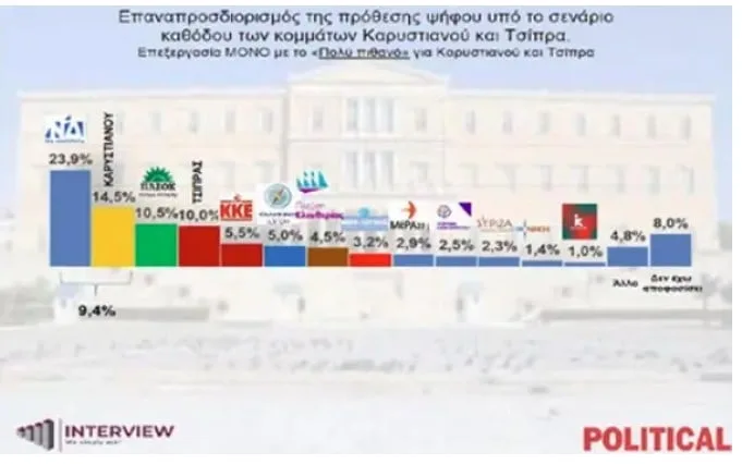 Έτσι, υπό το σενάριο καθόδου και των δύο κομμάτων, η πρόθεση ψήφου αναδιαμορφώνεται ως εξής: ΝΔ 23,9%, Καρυστιανού 14,5%, ΠΑΣΟΚ 10,5%, Τσίπρας 10%, ΚΚΕ 5,5%, Ελληνική Λύση 5%, Πλεύση Ελευθερίας 4,5%, Φωνή Λογικής 3,2%, ΜέΡΑ25 2,9%, Κίνημα Δημοκρατίας 2,5%, ΣΥΡΙΖΑ 2,3%, Νίκη 1,4%, Νέα Αριστερά 1%, «άλλο» 4,8%, «δεν έχω αποφασίσει» 8%.