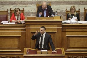 Ένταση μεταξύ Ηλία Κασιδιάρη και Νίκου Βούτση κατά τη διάρκεια της συζήτησης για τα δάνεια σε κόμματα και ΜΜΕ. Στο βήμα βρισκόταν ο βουλευτής της