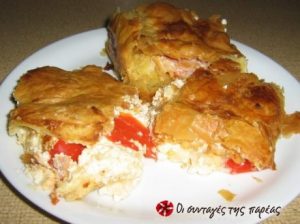 Τι χρειαζόμαστε: ½ κιλό φύλλο κρούστα (ή κουρού) 800 γρ. πιπεριές κέρατα 2 πιπεριές κόκκινες 2 πιπεριές πορτοκαλί 1 μικρό κρεμμυδάκι ½ κούπα τραχανά 1