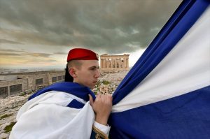 Στιγμιότυπο από την επίσημη έπαρση της ελληνικής σημαίας για το 2017, στον βράχο της Ακρόπολης.