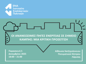 Το Παράρτημα Θεσσαλίας του Ινστιτούτου Εναλλακτικών Πολιτικών ΕΝΑ διοργανώνει δημόσια εκδήλωση-συζήτηση με θέμα «Οι Ανανεώσιμες Πηγές Ενέργειας σε σημείο καμπής: Μία κριτική προσέγγιση» την Παρασκευή 5