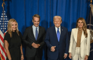 Το πρωθυπουργικό ζεύγος της Ελλάδος κατά την καθιερωμένη φωτογράφηση με το Προεδρικό ζεύγος των ΗΠΑ στο Λευκό Οίκο. Σεπτέμβριος 2025